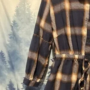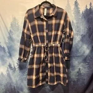 Blooming Jelly Plaid Flannel Shirt Dress With Puff Sleeves & Drawstring Waist S