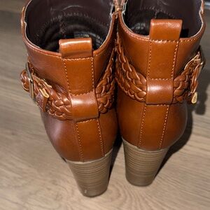Chic brown ankle boots with a braided strap. Features a sturdy block heel and side zipper for easy wear.