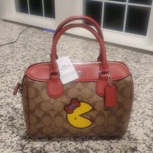 Chic Coach satchel with a fun graphic. Brown body with red handles and accents. Perfect for a stylish touch.