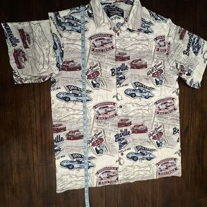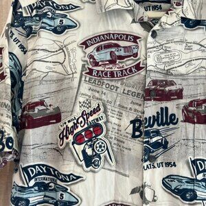 Classic shirt that's button down, cars, raceway, old cars, checkered flag, great condition