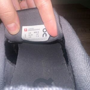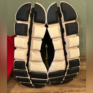 On Cloud Women’s Size 9.5 Black White Athletic Running Shoes Swiss Engineering. They do have very minimal wear on the heels pictured above. The soles have wear also pictured above. Otherwise in excellent condition