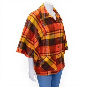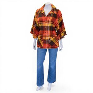 Bold 1970s Prior Western “Prior-Press” jacket in a rich harvest plaid of pumpkin orange, golden yellow, and brown. Made of 100% acrylic with a cozy, wool-like textured weave.