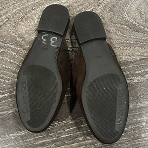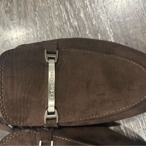 The Details: Features a rich, dark brown suede-like upper accented by an elegant silver-tone Calvin Klein hardware bit across the vamp.