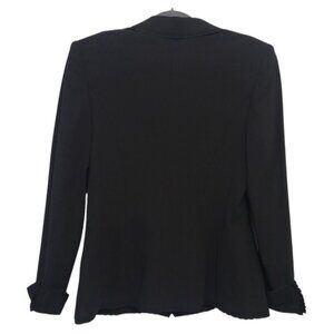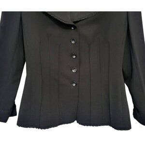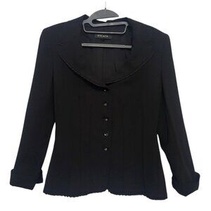 This Escada blazer is the definitive 2026 anchor for the 90s Minimalism think Carolyn Bessette-Kennedy. Masterfully constructed from premium virgin wool, with a subtle stretch for comfort. This is classic Escada precision — sculpted seaming, a softly contoured waist, and refined detailing that elevates even the simplest outfit. The minimalist ribbon ruffle trim at the collar, cuffs, and hem adds just enough feminine edge while keeping the silhouette sharp and professional. Structured but not heavy, it layers effortlessly for office, events, or polished everyday wear.