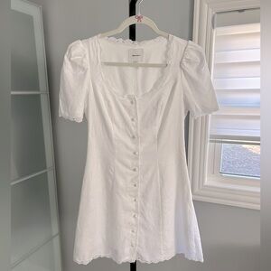 The Reformation Anabella Linen Mini Dress radiates effortless summer chic, blending lightweight linen fabric with a flattering silhouette for a timeless warm-weather staple