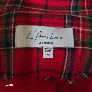 L'Academie red plaid light jacket in size XS, new without tags. The blazer features a double-breasted design with a matching tie-belt at the waist. The plaid pattern includes shades of red, green, blue, and white. It has a notched lapel collar and two front flap pockets. The shell is 100% cotton, and the lining is 100% rayon, extra buttons included. Measures approximately 18" chest measuring from underarm to underarm and 29" long measuring from back collar to hem.