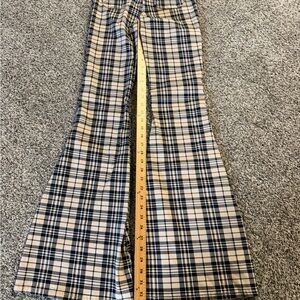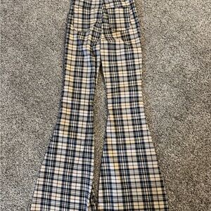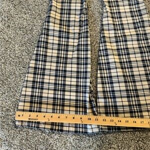 Stylish plaid boot cut flare pants perfect for any occasion. Featuring a classic black and cream checkered pattern, these pants offer both comfort and style.