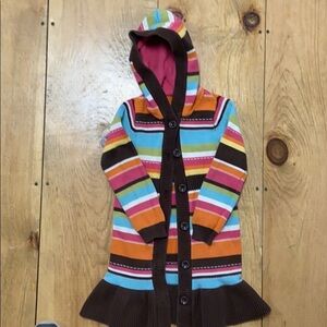 Super cute and warm Hanna Anderson stripped button front hooded sweater coat with multiple colors, primary color is a rich brown. Girls S 5-6 Heavy weight, 100% cotton. Ruffle trim at hem Good condition