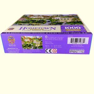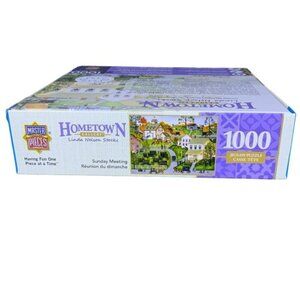 Piece together a slice of Americana with the Masterpieces 1000 Piece Jigsaw Puzzle Nostalgic Amish Village Sunday Meeting Scene by Folk Artist Linda Nelson Stocks captures the classic rustic charm and enduring spirit of the Amish Community Includes a Bonus Poster Rectangle 26.75” x 19.25” New In Sealed Box