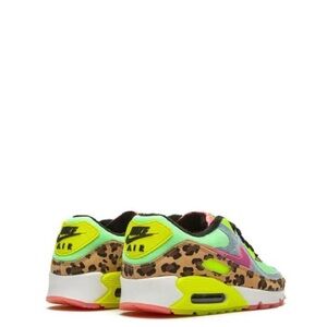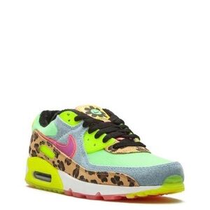 Nike Air Max 90 LX ‘Illusion Green’. Vibrant sneakers with leopard print accents. Features neon green, pink, and gray colors. Women’s size 8. Like new condition
