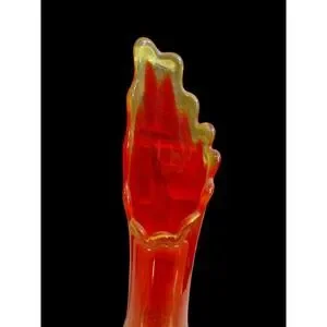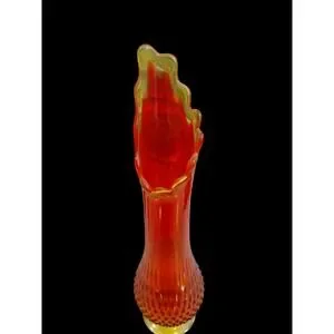 A striking vintage glass vase with a vibrant gradient of red to orange hues. This art glass piece features a textured hobnail pattern on the lower bulbous portion, transitioning to a smooth, tall body. The top of the vase flares out into a dramatic, fluted rim with a delicate yellow-green edge, resembling a flame or petal. The base is a solid, textured yellow glass that complements the vibrant colors of the body. This unique vase is a statement piece that showcases intricate craftsmanship and bold color.