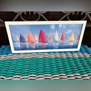 Vibrant sailboat art print featuring a variety of colorful sails. Set in a sleek white frame. Perfect for adding a splash of color to any room.