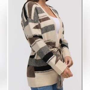 Anthropologie NVLT Stripe Tie Waist Jacquard Cardigan in Brown Mix Aztec