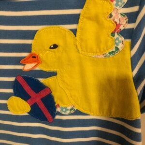 Charming dress with blue and pink stripes. Features delightful appliqué details.