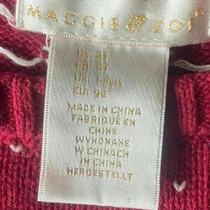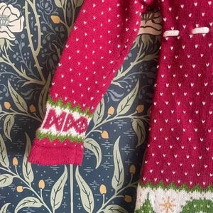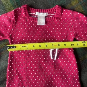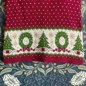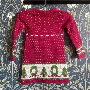 Maggie & Zoe knitted long-sleeve holiday jumper dress 2T. This red 100% cotton sweater dress features adorable colorwork Christmas trees, wreaths, and stars.