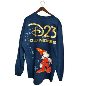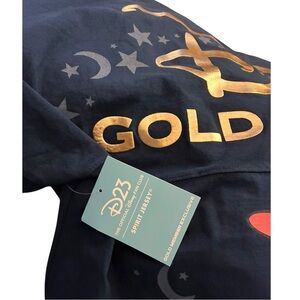 NWT Disney D23 Gold Member Exclusive Sorcerer Mickey Spirit Jersey in Size XL. This collector's piece features a navy blue body with gold foil D23 Gold Member branding across the back. The design highlights Sorcerer Mickey from Fantasia surrounded by celestial stars and moons. Made from 100% thick cotton with the signature Spirit Jersey oversized fit, drop shoulders, and banded cuffs. Brand new with original D23 tags attached. Perfect for Disney enthusiasts and D23 members.