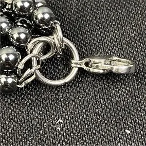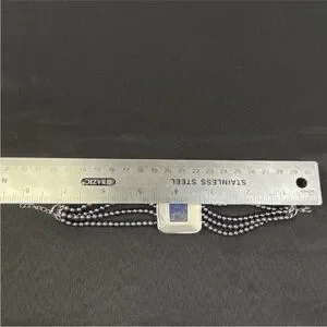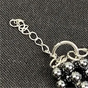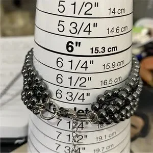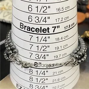 This is 7" on the smallest on the mandrel and has an adjustable chain that can bring it to 8" max. The design in the front is 1.25" x 1.75". There are 5" strands of hematite beads. Appears unused. Clean, no issues.