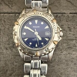 Elegant Pulsar watch featuring a silver band and deep blue dial. Ideal for versatile wear. Watch is not moving so it might need a new battery.