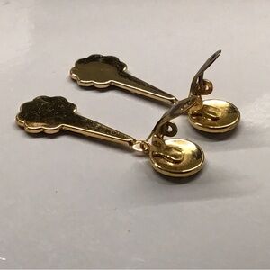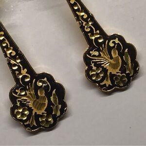 Lovely, vintage drop earrings. Chinoiserie design, black and gold etching. Clip on style, approximately 2 inches in length. Unique!