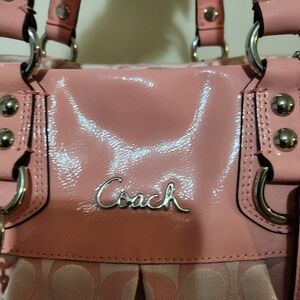 Chic Coach 2way shoulder/Handbag bag in blush pink. Features signature pattern and elegant design patent leather trim with Silver hardware. Perfect for any occasion. 2 little pink marks only callouts not noticeable at all. Outside no wear. Handles look like they were never used. Comes with Dustbag. size medium 12w x 17h inches not including strap 25h inches.