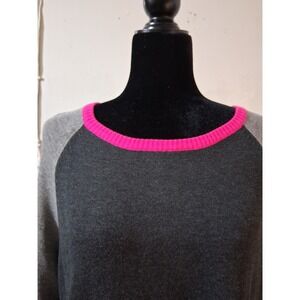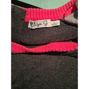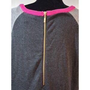Eliza J long sleeve knit sweater dress in a sophisticated color block design. This versatile piece features a dark charcoal grey body contrasted by light grey raglan sleeves and vibrant hot pink ribbed trim at the neckline, cuffs, and hem. The back is detailed with a polished gold-tone exposed zipper with a signature logo pull, adding a touch of modern flair to the classic shift silhouette. Crafted from a soft, mid-weight knit, it offers both comfort and style for office wear or weekend outings.
