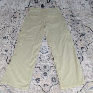 American Eagle stretch cargo pants in a soft olive green tone. Lightweight lyocell blend with stretch for comfort. Features cargo pockets and relaxed wide leg silhouette.