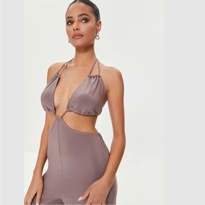 A woven jumpsuit featuring front cutouts, a plunging halter neckline, back self-tie closures, and a wide leg.