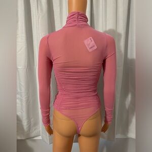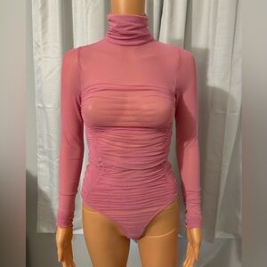 This is a pretty Fiji flower rose pink long sleeve mock neck sheer snap crotch rouched bodysuit
