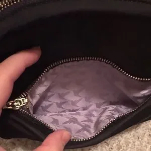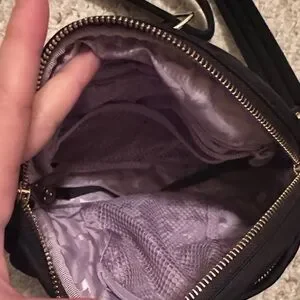 Gold hardware. Lavender interior. Black nylon exterior.