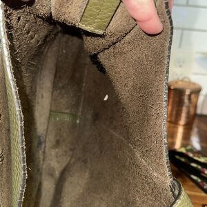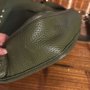 About 11" wide and 12" tall. Front pocket. Butter soft leather. Adjustable strap. Only callouts are slight smudge on front that I didn't notice till flash hit it and some staining inside at bottom. Both photographer. If anyone close enough to see those the. Check that your wallet is still in there 🤪
