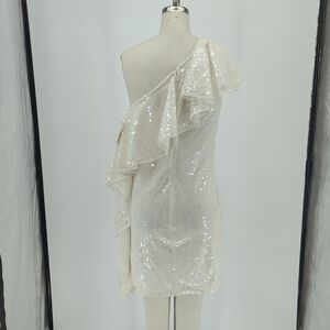 Shine in this elegant white sequin one-shoulder ruffle sleeve dress. Perfect for special occasions.