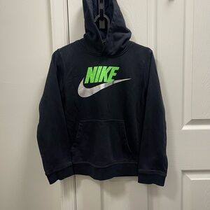 Stylish black hoodie featuring a bold neon green Nike logo and sleek silver details. Perfect for casual wear.