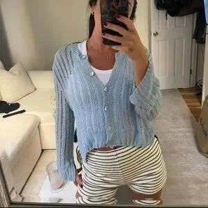 Round neck long sleeve cardigan. Openwork detail. Front button closure.