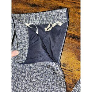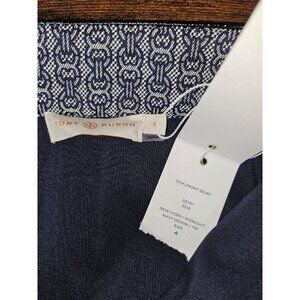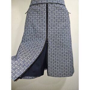 Chaumont Skirt A Line Mini Jacquard Ivory Midnight Navy Gemini Size 4 Introducing the Chaumont Logo Print Tweed A-line Mini Skirt by TORY BURCH, where classic heritage style meets contemporary design. This skirt features a polished blend of 58% cotton and 42% polyester, and showcases a modern edge with its glossy piping and front zip that runs up from the hem. The heritage chain-patterned jacquard and side zip closure, along with front zip-welt pockets, add functional style to this chic A-line piece. Care instructions recommend dry cleaning to maintain its elegant silhouette in a sophisticated blue hue. Tuck in your favorite tee for a more laid-back vibe!