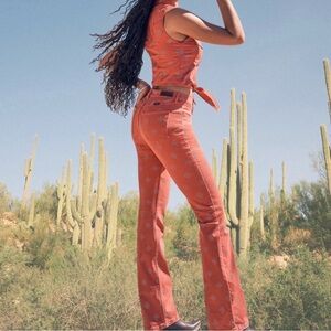Wrangler jeans jeans bandana print jeans diamond print jeans high rise bootcut jeans red coral denim western fashion country concert rodeo jeans festival western cowgirl aesthetic desert