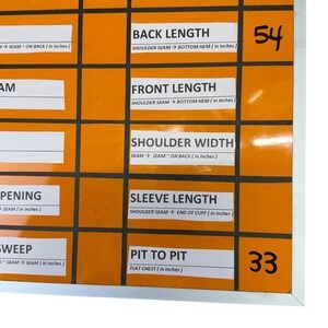 Actual measurements: Back length: 54 in, Pit to pit (flat chest): 33 in.