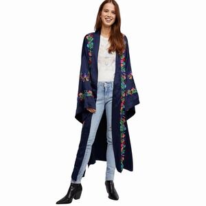 Free People "The Exclusive" Kimono Robe Womens L Blue Satin Belted Embroidered Floral Boho