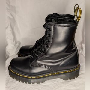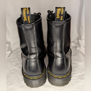Classic black leather boots with Dr. Martens' signature yellow stitching. These feature a platform sole and a sleek coating on the durable leather uppers.