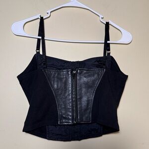 This leather corset top is *chef’s kiss*!! It’s got adjustable straps, clasps in the front and a zipper in the back! It also has the stretchy panels on the side to keep you comfy while looking cool!