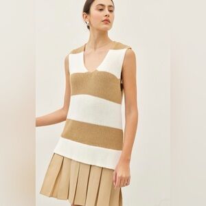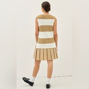 Chic and stylish, this sleeveless dress features bold tan and white stripes. Perfect for any occasion, it offers a comfortable and fashionable fit.