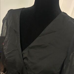 Elegant black dress with cream detailing. Long sleeves and flattering silhouette. Ideal for any event.