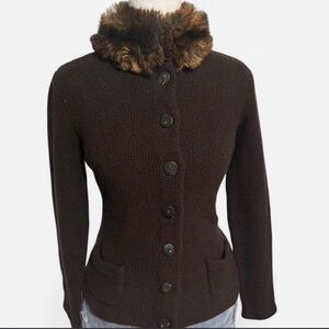 Vintage Ralph Lauren Lambswool Brown Button Front Sweater with Faux Fur Collar