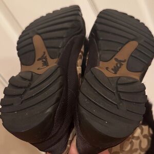 Stylish Coach boots with black fur trim. Brown patterned design adds elegance. Ideal for winter wear.