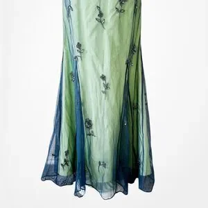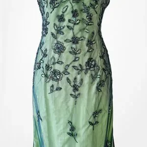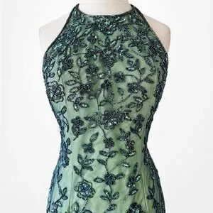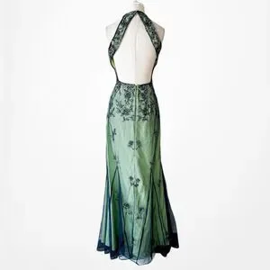 Vintage Y2K 90s Green Floral Halter Beaded Mesh Bodycon Maxi Prom Dress Size S