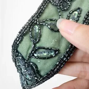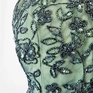 Pre-loved. Excellent. Some loose threads/missing beads. Minor tear in the back near back hook. Small stain near hem. Flaws not very noticeable