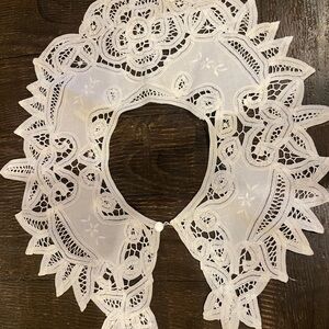 This item is a vintage Battenberg lace collar, often styled with Victorian or Edwardian influences and featuring a white floral design. Excellent condition!