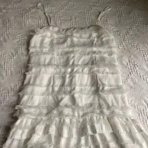 Ruffle mini dress with adjustable straps, worn only once! Runs small for size 10, fits a size 8, no stretch linen fabric