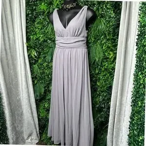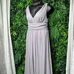 Keywords: maxi dress, evening gown, formal dress, party dress, sleeveless dress, gray dress, long dress, bridesmaid dress, wedding guest dress, prom dress, special occasion dress, v neck dress, size large