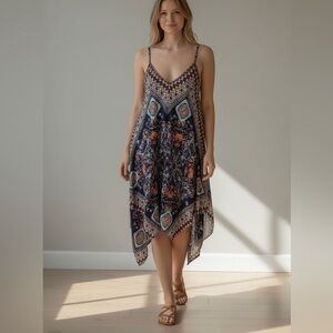 VENUS Navy and Orange Patterned Hankerchief Dress