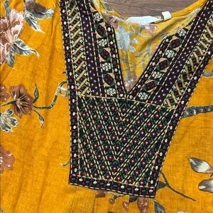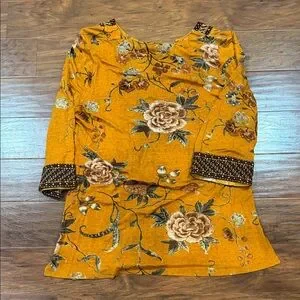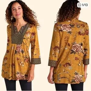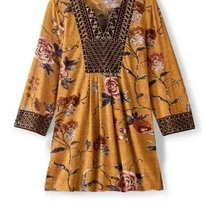 Chic mustard tunic with floral design. Features intricate patterns and a relaxed fit.